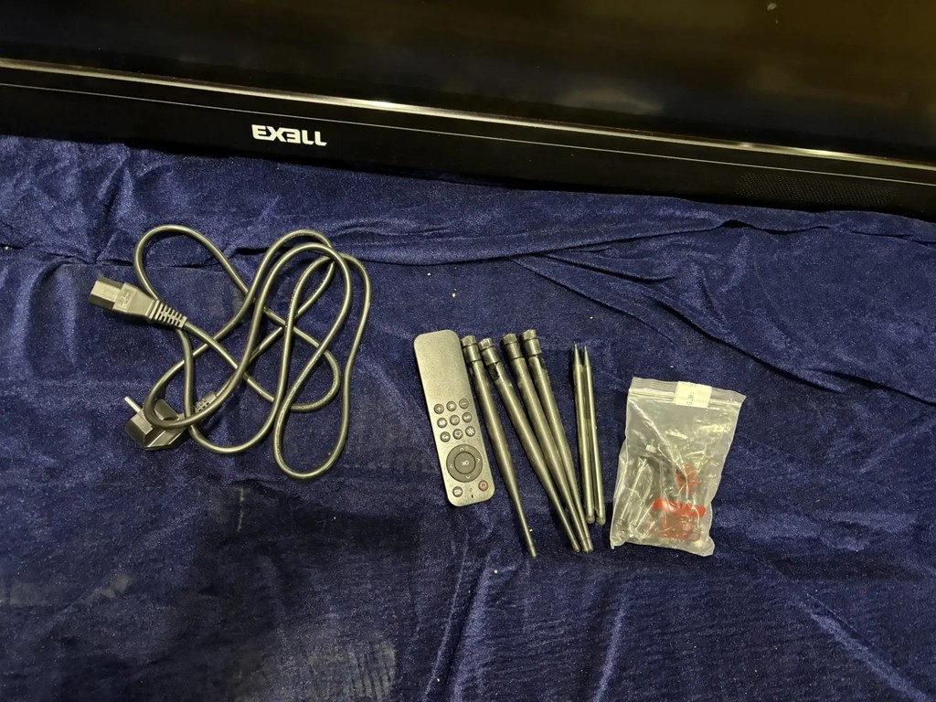 Упаковка вскрывалась, сильно рваная, перескоченная. Оборудование использовалось . В комплектации: пульт, кабель питания, стилусы, антенны, крепления нет.