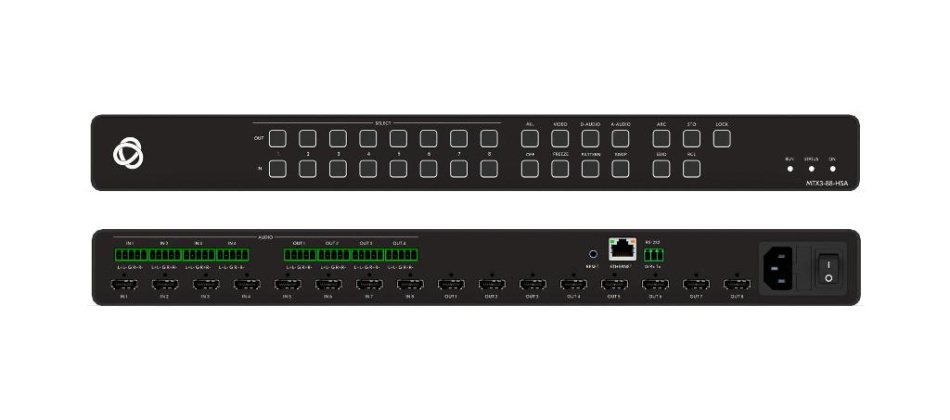 MTX3-88-HSA — матричный коммутатор 8х8 сигналов HDMI разрешением до 4K@60 Гц с встроенными масштабаторами, обеспечивающими быстрое (<1 с) и бесподрывное переключение входов. Каждый выход HDMI поддерживает понижающее или повышающее масштабирование для учета разницы в возможностях источника и потребителя аудио-видео сигнала. Встроенная аудиоматрица с четырьмя аналоговыми аудиовходами и четырьмя аналоговыми аудиовыходами поддерживает переключение любого цифрового или аналогового аудиоисточника на потребитель сигнала, включая источники возвратного звукового сигнала ARC (Audio Return Channel).