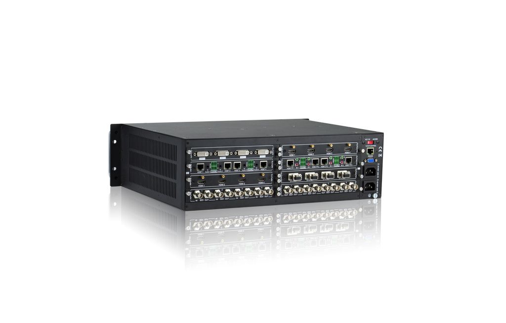 Комплект модулей, состоящий из шасси модульной матрицы MMA-16N и входящих MMA-I4-UH (3 шт), MMA-I4-BT и выходящих MMA-O4-UH (2 шт), MMA-O4-BT (2 шт) плат. Имеет веб интерфейс и возможность управления через TCP/IP.