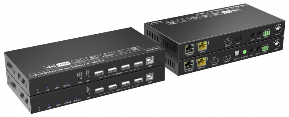 HDBT 3.0 (без сжатия) - HDMI 2.0, 4K 60Гц 4:4:4 (18Гб/с), 4K до 100м по FTP Cat 5e/6/6a, USB 2.0 A+B, де-эмбеддер, RS232, Ethernet, ARC, PoC двусторонний